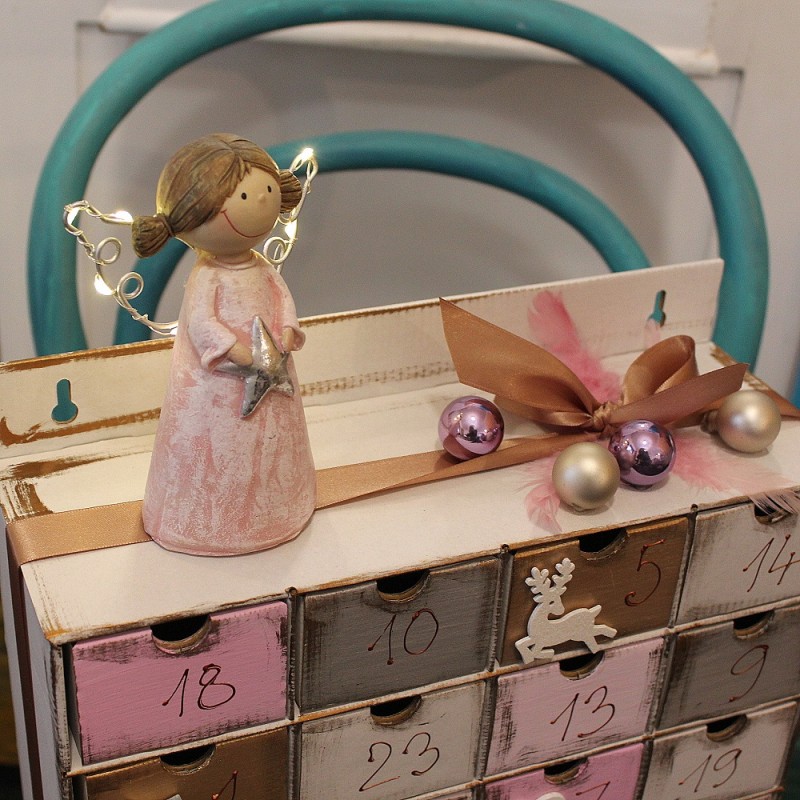 Adventní kalendář je vyroben z pevné třívrstvé lepenky. Kalendář je patinován a dozdoben roztomilou figurkou anděla s lucerničkou. Anděl je dodáván volně, protože má zespodu zapínání světýlek na křídlech, která lze rozsvítit a kalendář je pak nádhernou vánoční dekorací kdekoliv jej postavíte.