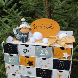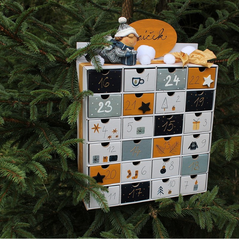 Tento originální adventní kalendář pro děti udělá radost i dospělým a navíc krásně dozdobí váš interiér. Šuplíčky jsou dostatečně veliké na spoustu dobrot. Po vánocích lze využít jako šperkovnici nebo na různé poklady.