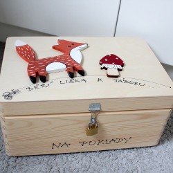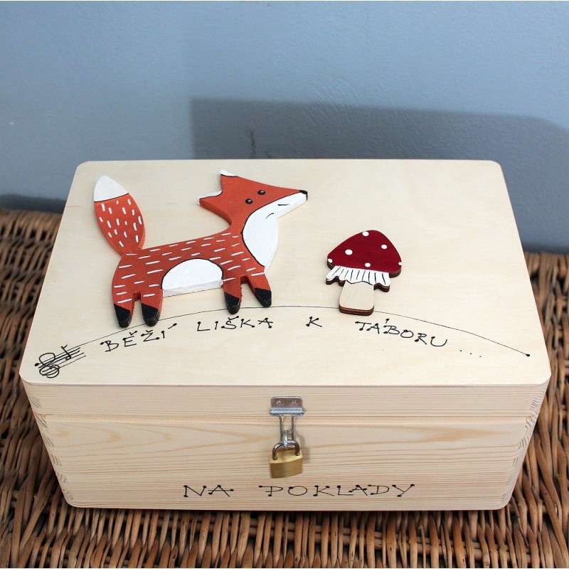 Dřevěná krabice s vyřezávaným motivem lišky a muchomůrky je malovaná barvami na dřevo. Krabička je s panty, má zaoblené hrany, je pevná, masivní.