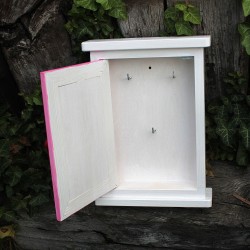 Dřevěná skříňka na klíče má vzadu 2 očka na zavěšení a uvnitř jsou přidělány 3 háčky na klíče.