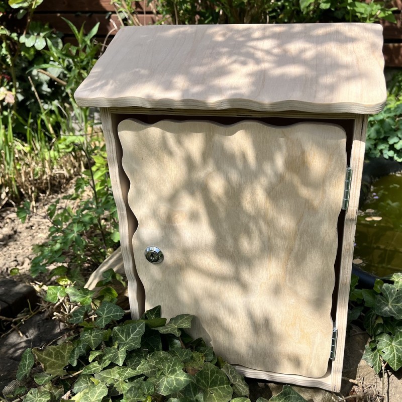 Tato velká poštovní schránka ze dřeva je vyrobena z pevné 10mm silné voděodolné lepené borovicové desky. Schránka je uzamykatelná, součástí jsou 2 klíče. Střecha má vyřezávaná dvířka a stříšku ve tvaru vln, čím schránka zaujme na první pohled.