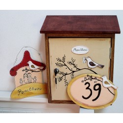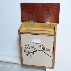 Dřevěná poštovní schránka z pevné 10mm silné překližky. Schránka je uzamykatelná, součástí jsou 2 klíče. Otvor v horní liště pod stříškou má rozměr 20x2cm. Schránka je napuštěna proti plísni, malována akrylovými barvami a přelakována venkovním lakem.