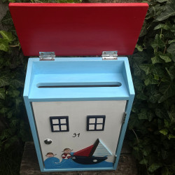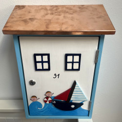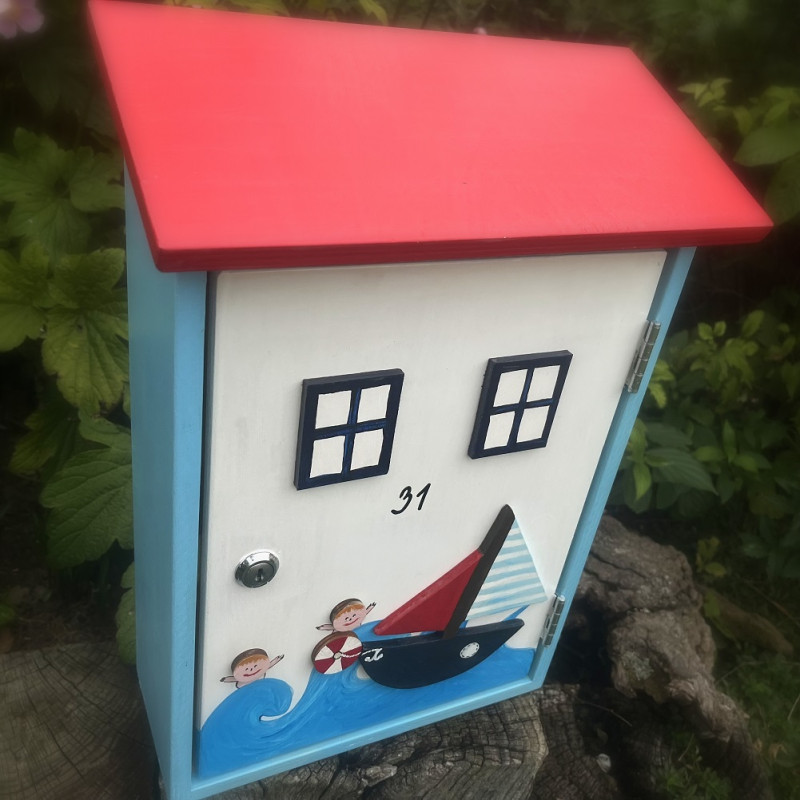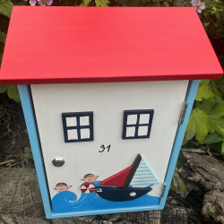 Dřevěná poštovní schránka je napuštěna proti plísni, malována akrylovými barvami a přelakována lodním lakem. Je dozdobena vyřezanou plachetnicí a malovaným obrázkem.