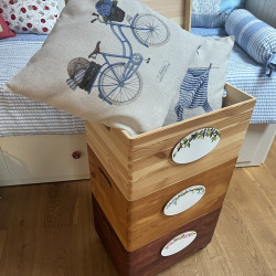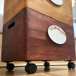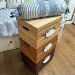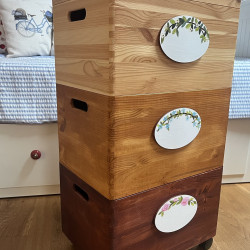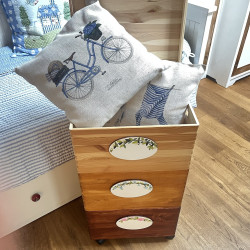 Dřevěná masivní truhla na kolečkách je mořená v barvě dřeva a dozdobena vyřezávanou malovanou cedulkou. Na ní je posazena další bedýnka mořená v malinko světlejším odstínu a opět zdobená malovanou cedulkou. A poslední bedýnka má víko a opět cedulku. Na každou cedulku vám můžeme namalovat náš nebo váš motiv a dopíšeme váš text. Pokud si budete přát vlastní motiv na cedulky, napište nám prosím vaše přání do poznámky na konci objednávky.
