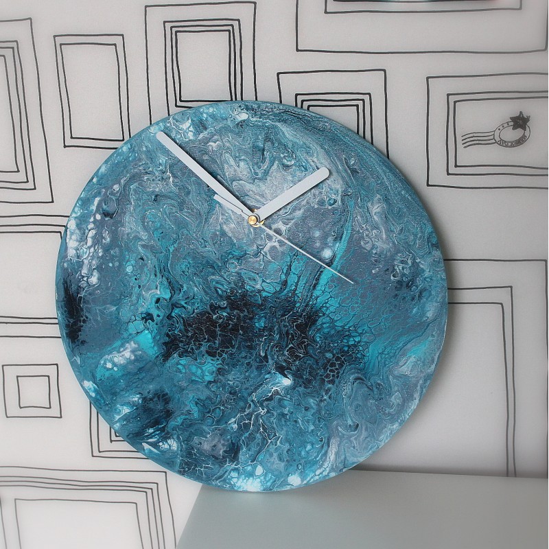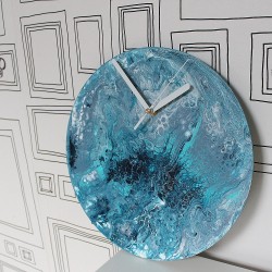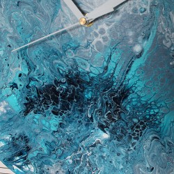 Moderní nástěnné hodiny jsou malované metodou akrylového lití na překližku. Na hodinách se prolínají odstíny modré a tyrkysové. Někomu mohou připomínat oceán, jiným zase vesmír. Jsou přelakované pro snadné otírání.