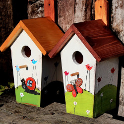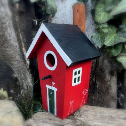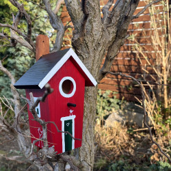 Dřevěná malovaná ptačí budka ve skandinávském stylu je přelakována lodním lakem.