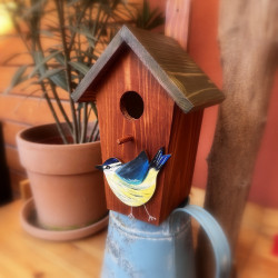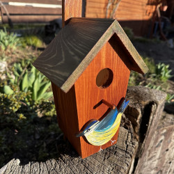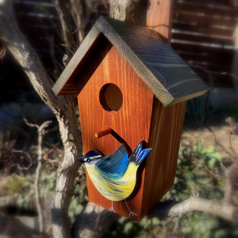 Dřevěná malovaná ptačí budka s vyřezávaným a malovaným motivem sýkorky je přelakována lodním lakem.