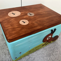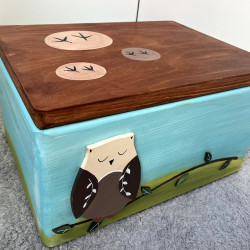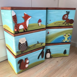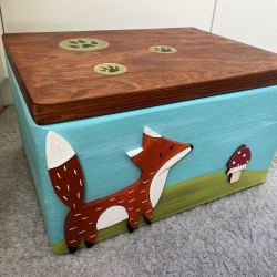 Dřevěná truhla na hračky s motivem vyřezávaných zvířátek z lesa je další z naší série malovaných truhel. Krabice je malovaná barvami na dřevo a přelakovaná pro snadné otírání. Je opravdu veliká, takže poklady mohou být všechny pohromadě.