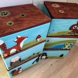 Tyto dřevěné truhly byly vyrobeny pro mateřskou školu na různé hry a cesty za pokladem. Pokud byste si přáli změnit motiv, napište nám a domluvíme se.