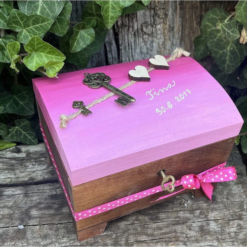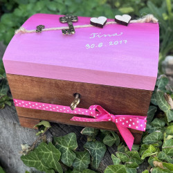 Dřevěná krabička v krásných stínovaných růžových tónech je malovaná barvami na dřevo, dekorovaná a přelakovaná pro snadné otírání. Může sloužit jako krabička na prstýnky, šperky nebo třeba na nějaké překvapení či drobné vzpomínky.