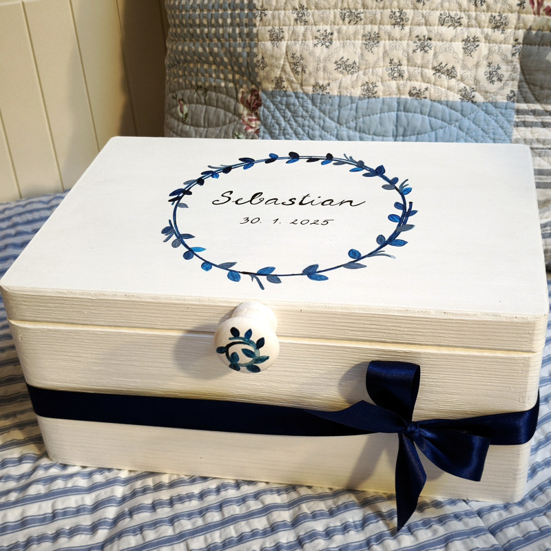 Tento malovaný personalizovaný box může být krásným dárkem ke křtinám nebo u příležitosti narození dítěte.
