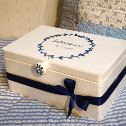 Dřevěná krabice s malovanými lístky. Uchovejte si vzpomínky, které oživí jedinečnost okamžiků spojených s narozením vašeho miminka a jeho dětstvím, v této personalizované originální krabici.