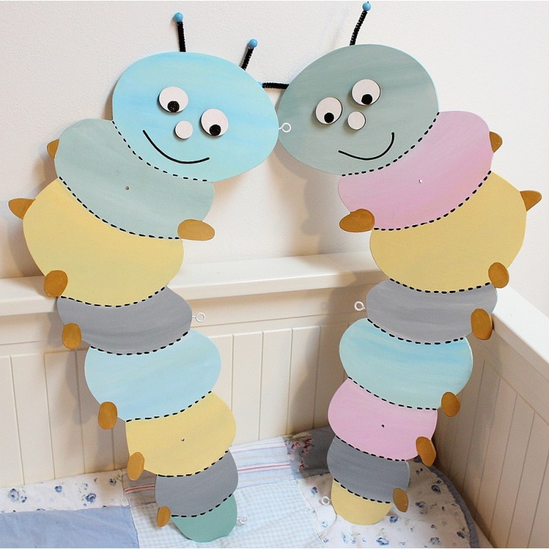 Velikost jedné housenky je cca 60x31cm, celkovou šířku nástěnky lze regulovat v závislosti na délce provázků. Součástí šňůry je 6 kolíčků. V nástěnce jsou předvrtané díry k uchycení na zeď. Vše je přelakováno pro snadné otírání.