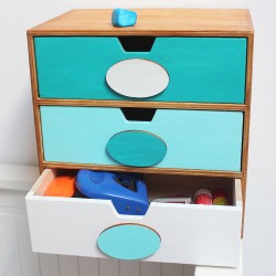 I váš pracovní stůl může vypadat stylově a vesele. Ukliďte všechny drobnosti a nezbytnosti ze stolu do šuplíků této komodky a vaše pracovní nálada se pozvedne do tyrkysových výšin.