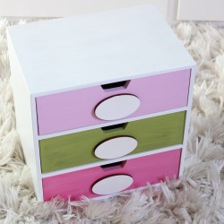 Dřevěná komoda se třemi šuplíky může sloužit také jako šperkovnice na poklady malých i velkých slečen nebo švadlenkám na šitíčko. Šperkovnice je malovaná akrylovými barvami a přelakovaná.