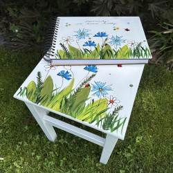 Dřevěná stolička je malovaná akrylovými barvami s motivem kopretin, heřmánku a chrpy, je přelakovaná.