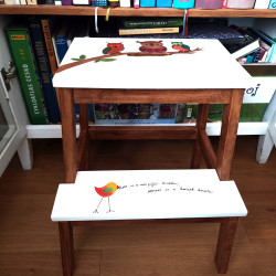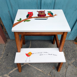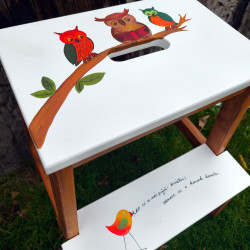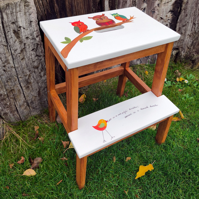 Dřevěné schůdky jsou malované akrylovými barvami a jsou přelakované pro snadné otírání. Lesní motiv se sovičkami lze na přání změnit. Napište nám.