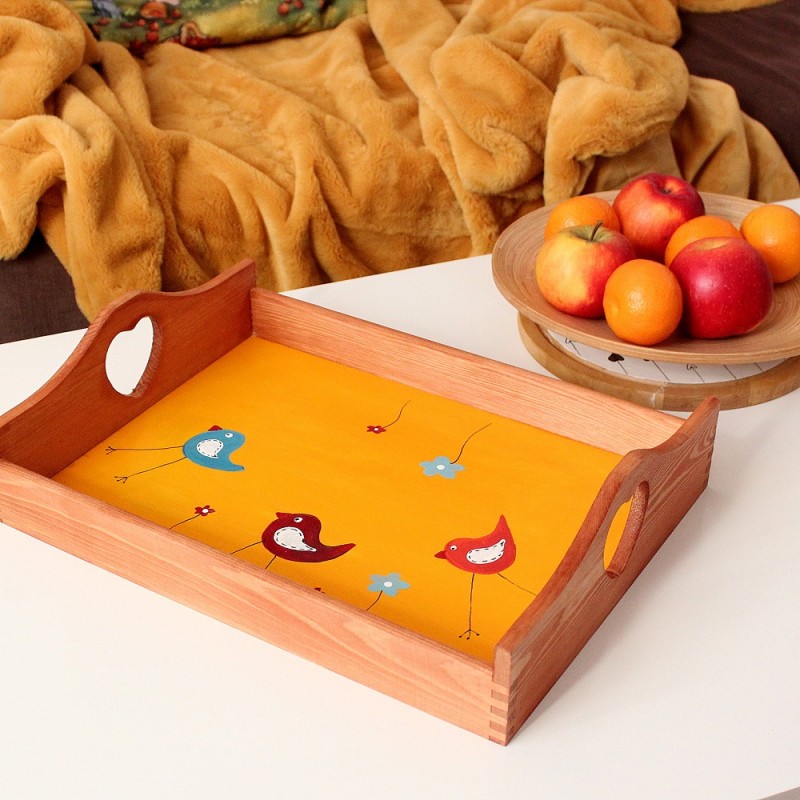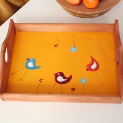 Dřevěný podnos v žlutých tónech s dekorem ptáčků je malován barvami na dřevo a přelakován pro snadné otírání.