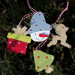Dekorace nejen na vánoční stromeček jsou vyřezané z překližky, malované, patinované a přelakované. Zavěšené na zdobeném provázku.
