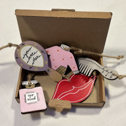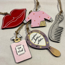 Dekorace nejen na vánoční stromeček s elegantními motivy parfému, zrcátka, hřebene, pulovru a svůdných rtů.